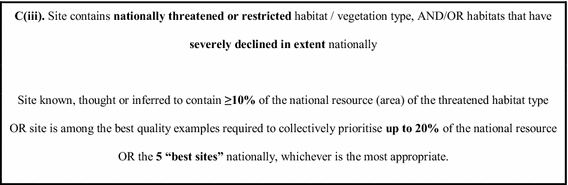 The revised global IPA criteria are presented in “The revised IPA selection criteria” section of this paper, together with guidance notes on how to apply them. Several of the criteria that have been formally adopted here have already been tested successfully in previous IPA assessments; for example the modified sub-criteria A(iii) and A(iv) have been used widely in the Mediterranean region (Radford et al. 2011). The new sub-criterion B(ii): “exceptional number of species of high conservation importance”, which we envisage may be widely applied in place of criterion B(i) in countries that lack a detailed habitat classification, has been tested using several available datasets for the tropics in order to ensure that the threshold is neither too restrictive nor too easily met; this testing will be presented in a separate publication (Darbyshire et al. in prep.). However, we emphasise that the identification of IPA networks, and the criteria on which they are based, is an iterative process and we will continue to learn from the experiences of applying the IPA approach in new regions and in light of fresh conservation challenges.