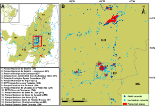 We thank the curators of the herbaria visited, as well as Aécio Amaral, Alessandra Fidelis, Anderson Sevilha, Glocimar Pereira-Silva, and the managers of reserves surveyed for support during fieldwork. ICMBio authorized us to carry out research in national parks (permit SISBIO 42461). We acknowledge financial support from CNPq (Project “Conservação de Recursos Genéticos Nativos e Parentes Silvestres da Flora do Cerrado”; n. 457438/2012-6) under the Rede de Pesquisa Biota Cerrado, the Brazilian Ministry of Environment/GEF Cerrado Project, and Embrapa.