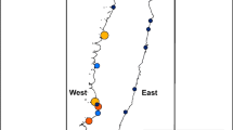 The main effects considered were type of colony (control vs. visited), number of visitors, season, and environmental variables; the latter included surface air temperature and a number of variables (see below) related to the sea ice state and year. Only models with sea ice variables that were not highly correlated were fitted to avoid collinearity effects. Then, model selection accounted for the best set of variables amongst all possible modelling options. The chosen variables represented collectively how the sea ice environment might affect the current penguin breeding season and were selected from previous analyses of the best predictors of penguin population dynamics (e.g. Forcada et al. 2006). Sea ice can reduce or prevent access to breeding sites and foraging sites; precipitation depends on air temperature and can affect breeding success through nest burial by snow or flooding from snow-melt or rainfall (Lishman 1985; Forcada et al. 2006; Forcada and Trathan 2009). Monthly surface air temperatures were obtained from Faraday/Vernadsky research station records, which is the closest long term record available (data available at the British Antarctic Survey; https://legacy.bas.ac.uk/met/READER/surface/Faraday.12.temperature.html). Sea ice variables were obtained from the US National Snow and Ice Data Center (NSIDC) (http://nsidc.org/), using daily images of sea ice concentrations from Nimbus-7 SMMR and DMSP SSM/I-SSMIS Passive Microwave Data, Version 1 (Cavalieri et al. 1996). To calculate the seasonal sea ice cycle, sea ice data local to Goudier Island were selected with a polygon described by coordinates − 62.53, − 62.55; − 61.26, − 63.75; − 65.11, − 66.24; − 68.44, − 64.92; − 66.54, − 64.04; and − 64.63, − 63.28 of longitude and latitude. We chose a sea ice minimum threshold of 15% for consistency with previous studies using the same data sets; this concentration is the minimum reliably detectable with satellite imagery and is used to track the ice edge (Stammerjohn et al. 2008a, b). Sea ice variables included; (1) day of advance: first day when sea ice concentration exceeds 15% for at least 5 consecutive days; (2) day of retreat: first day when sea ice concentration remains < 15% until end of period; (3) ice season duration: the total number of sea-ice days (between day of advance and retreat); (4) actual ice days: number of days sea ice was present in the polygon area; (5) minimum sea ice extent: minimum (< 15%) sea ice concentration reached within the polygon area; (6) sea ice minimum: day of the year when the sea ice extent is at its lowest; (7) maximum sea ice extent: maximum % concentration of sea ice within the polygon area; and (8) sea ice maximum: day of the year when sea ice reaches its largest extent within the polygon area.