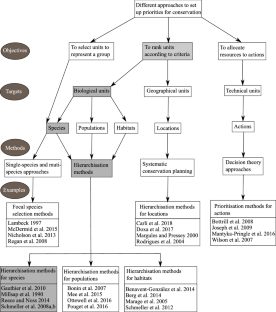 Hierarchisation and prioritisation methods represent a crucial step to determine priorities and implement actions in conservation biology: they are required to determine how to allocate available resources to the different components of biodiversity. However, they are very heterogeneous in terms of targets and goals. The main differences are presented with a focus on hierarchisation methods targeting species. This paper reviews 40 studies using 24 different point-scoring or rule-based methods aiming to determine conservation concerns for species. Only the hierarchisation methods targeting species were compared and their differences where highlighted in terms of study area, taxa, criteria assessment and summarisation. Then six different studies using the same hierarchisation method for species were compared as well. This study enables to analyse the different existing methods in order to perform more relevant methodological choices adapted to the objective and the context of each selection process. A consistent framework is designed to help managers to choose an appropriate method using well-defined goals, study areas and taxonomic targets, and take into account data availability.