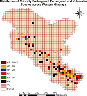 Assessing the impact of threats, identification, prioritization and predicting conservation pockets are vital for the conservation and management of threatened species. This study investigated the diversity and distribution through inventorization and analysis of International Union for Conservation of Nature (IUCN) categorized threatened plants and their prioritization for conservation. A total of 456 threatened taxa belonging to 233 genera coming under 87 families were recorded as threatened under various threat categories of IUCN. Among lited taxa, 64 species were falls under higher risk of extinction categories of IUCN viz. Critically endangered, Endangered, and Vulnerable with 13, 28 and 23 species respectively. Maximum number of threatened plants was found (84 species) in family Fabaceae followed by Cyperaceae (65 species) and Poaceae (36 species). Richness of threatened plants was found maximum in the Sikkim (203) followed by Himachal Pradesh (190) and Jammu & Kashmir (189). Major causes of depletion of threatened taxa were anthropogenic activities such as habitat loss, overgrazing, deforestation, over-exploitation and unsustainable harvesting of medicinal plants. Therefore, conservation of all the inventorized 64 threatened plants is needful at its earliest. Thus the strategies for the conservation of threatened species must be directed towards those species facing highest risk of extinction, biologically distinct and ecologically valuable for the ecosystem as well having socio-economic significance. Considering this, prioritization of the threatened species was done following existing methodologies. Among the threatened taxa, Angelica glauca, Coptis teeta, Lilium polyphyllum, Nardostachys jatamansi, Aconitum heterophyllum and Gentiana kurroo etc. are ranked at apex, thus needs higher priority for conservation. The study further indicate that six species such as Angelica glauca, Coptis teeta, Gymnocladus assamicus, Illicium griffithii, Piper pedicellatum and Saussurea costus are endemic, having restricted distribution, however highly traded in the IHR. Thus, it is proposed that these species must be taken under special apprehension for conservation planning. Besides this for the conservation of higher risk of extinction species, grid mapping of targeted species was done for identifying specific distribution areas for effective conservation.