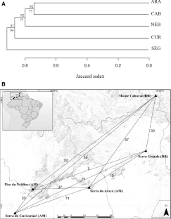 We investigated the species richness, endemism, and similarity of the bryoflora (mosses and liverworts) on five Brazilian Amazon mountains (four Tepuis and one rocky outcrop), to determine the floristic relationships between them using presence/absence matrix. Cluster analysis based on the Jaccard index was used to determine similarities between the plant assemblages in five areas. We also performed a principal component analysis to determine which abiotic variables best explained the variations between those mountains. We surveyed the bryophyte species on each of the five mountains to identify the diversity of mosses and liverworts and to answer to the following questions: (1) How many bryophyte species are there in total area (gama diversity) and on each mountain (alpha diversity)? (2) Do mosses and liverworts share patterns of diversity? (3) Can patterns of alpha diversity be used to predict patterns of beta diversity? (4) What are the species distribution patterns? (5) How many endemic species are there in the mountains? and, (6) Is there high similarity among those bryophyte floras? We encountered 425 species, 144 genera, and 51 families of bryophytes, with Lejeuneaceae and Lepidoziaceae being the richest families. A considerable number of floristic novelties were encountered: 18 species new to Brazil; 39 species new to northern Brazil; 21 species new to Amazonas State; and 2 species new to science and only recently described. Over 43% of the bryophytes have a tropical America distribution, approximately 7% are Pantropical, 6.5% are Afro-American, and 3% are endemic to Brazil (6 liverworts and 6 mosses), and 6% are widespread globally. We present a checklist of 425 bryophyte species (144 genera and 51 families) of which 12 are endemic. Patterns of endemism of the bryophyte flora on the Tepuis differ from those exhibited by angiosperms (in the latter three times higher). Thirty-nine of these species were new for the Amazonia domain in Brazil, increasing by 7% the previous total of Amazonian recorded species. The similarity between sites was low, ranging from 3 to 25%. PCA analysis showed temperature variables explaining the greater part of the variance (76.6%) between the mountains. Our results demonstrate that patterns of alpha diversity cannot be used to predict patterns of beta diversity. This paper represents the first evaluation of bryophytes on five Brazilian Amazon mountains, giving insight into their species richness, endemism, and similarity, and providing baseline information for analyzing species’ turnover rates, migration, invasion events, etc. These results also represent an increase in our general knowledge of the Brazilian bryoflora and are relevant to the conservation of bryophyte diversity in the Amazon forest, and represent a contribution toward the targets of the Global Strategy for Plant Conservation.
