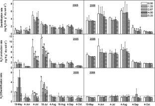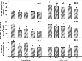 N2O production from denitrification in soils contributes to the enhanced greenhouse effect and the destruction of the stratospheric ozone. Ungulate grazing affects denitrification and the production of N2O. The short-term effect of grazing on denitrification and N2O production has been examined in several grassland ecosystems. However, the effects of long-term grazing have rarely been studied. We measured denitrification and N2O production during the 2005 and 2006 growing seasons in a long-term (17 years) experiment that had five grazing intensities (GI; 0.00, 1.33, 2.67, 4.00 and 5.33 sheep ha−1). We found that denitrification and N2O production rates were seasonally variable during the measurement period, with higher values observed in summer and lower values found in spring and autumn. The grazed treatments resulted in decreased denitrification and N2O production, primarily due to the reduced soil nitrate concentration and organic N content under the long-term grazing. This supported our hypothesis that long-term over-grazing suppresses denitrification and N2O production. Although significant differences in denitrification and N2O production were not found between the four GI, there was a general trend that cumulative denitrification and N2O production decreased as grazing intensity increased, especially in 2006. Lower N losses via denitrification and N2O production in the grazed plots, to some extent, may contribute to the mitigation of greenhouse gas emission and help to preserve soil N and ameliorate the negative impacts of grazing on plant growth, productivity, and ecological restoration processes in the temperate steppe in northern China.