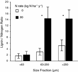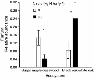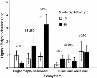 Recent research has dramatically advanced our understanding of soil organic matter chemistry and the role of N in some organic matter transformations, but the effects of N deposition on soil C dynamics remain difficult to anticipate. We examined soil organic matter chemistry and enzyme kinetics in three size fractions (>250 μm, 63–250 μm, and <63 μm) following 6 years of simulated atmospheric N deposition in two ecosystems with contrasting litter biochemistry (sugar maple, Acer saccharum—basswood, Tilia americana and black oak, Quercus velutina—white oak, Q. alba). Ambient and simulated (80-kg NO3 −–N ha−1 year−1) atmospheric N deposition were studied in three replicate stands in each ecosystem. We found striking, ecosystem-specific effects of N deposition on soil organic matter chemistry using pyrolysis gas chromatography/mass spectrometry. First, furfural, the dominant pyrolysis product of polysaccharides, was significantly decreased by simulated N deposition in the sugar maple–basswood ecosystem (15.9 vs. 5.0%) but was increased by N deposition in the black oak–white oak ecosystem (8.8 vs. 24.0%). Second, simulated atmospheric N deposition increased the ratio of total lignin derivatives to total polysaccharides in the >250 μm fraction of the sugar maple–basswood ecosystem from 0.9 to 3.3 but there were no changes in other size classes or in the black oak–white oak ecosystem. Third, simulated N deposition increased the ratio of lignin derivatives to N-bearing compounds in the 63–250 and >250 μm fractions in both ecosystems but not in the <63 μm fraction. Relationships between enzyme kinetics and organic matter chemistry were strongest in the particulate fractions (>63 μm) where there were multiple correlations between oxidative enzyme activities and concentrations of lignin derivatives and between glycanolytic enzyme activities and concentrations of carbohydrates. Within silt-clay fractions (<63 μm), these enzyme-substrate correlations were attenuated by interactions with particle surfaces. Our results demonstrate that variation in enzyme activity resulting from atmospheric N deposition is directly linked to changes in soil organic matter chemistry, particularly those that occur within coarse soil size fractions.