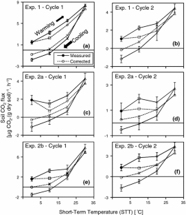 This study sought to investigate the hourly and daily timescale responses of soil CO2 fluxes to temperature in a limed agricultural soil. Observations from different incubation experiments were compared with the results of a model combining biotic (heterotrophic respiration) and abiotic (carbonate weathering) components. Several samples were pre-incubated for 8–9 days at three temperatures (5, 15 and 25 °C) and then submitted to short-term temperature (STT) cycles (where the temperature was increased from 5 to 35 °C in 10 °C stages, with each stage being 3 h long). During the temperature cycles (hourly timescale), the soil CO2 fluxes increased significantly with temperature under all pre-incubation temperature (PIT) treatments. A hysteresis effect and negative fluxes during cooling phases were also systematically observed. At a given hourly timescale temperature, there was a negative relationship of the CO2 fluxes with the PIT. Using the combined model allowed the experimental results to be clearly described, including the negative fluxes and the hysteresis effect, showing the potentially large contribution of abiotic fluxes to total fluxes in limed soils, after STT changes. The fairly good agreement between the measured and simulated flux results also suggested that the biotic flux temperature sensitivity was probably unaffected by timescale (hourly or daily) or PIT. The negative relationship of the CO2 fluxes with the PIT probably derived from very labile soil carbon depletion, as shown in the simulations. This was not, however, confirmed by soil carbon measurements, which leaves open the possibility of adaptation within the microbial community.