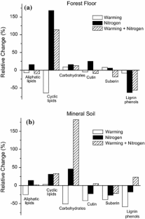 Rising temperatures and nitrogen (N) deposition, both aspects of global environmental change, are proposed to alter soil organic matter (SOM) biogeochemistry. For example, increased plant productivity and enhanced microbial decomposition of litter and SOM may reduce soil carbon stocks and fertility. To better understand SOM biogeochemical shifts at the molecular-level, we employed an array of biomarker and nuclear magnetic resonance (NMR) techniques to investigate the composition and degradation of SOM components in the forest floor and mineral soil horizons of warmed (5 °C above average soil temperature) and N fertilized (5 g m−2 year−1 N applied in the growing season) plots from the soil warming × nitrogen addition study at the Harvard Forest, MA, USA. Biomarker analyses indicated increased plant-derived inputs into the forest floor under N fertilization. Soil warming promoted the decomposition of plant-derived aliphatic and cyclic compounds in the forest floor. Cutin degradation was observed in the heated forest floor which also exhibited relatively higher microbial activity. Lignin oxidation was also observed but was most pronounced in the mineral horizon of the heated plots. These results suggest that continued soil warming may promote the degradation of lignin- and cuticle-derived SOM. N fertilization also enhanced lignin oxidation but to a lesser extent likely due to a decline in microbial activity. 1H NMR spectra of the mineral soils revealed enrichment of plant-derived alkyl structures and microbial-derived organic matter with both soil warming and N fertilization. Overall, this study shows that the decomposition and accumulation of molecularly distinct SOM components occurs with soil warming and N amendment and may subsequently alter soil biogeochemical cycling.