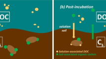 The amount of DOC released into solution when the initial DOC concentration is 0 mg/L, b from Eq. (2), has a median value of 0.08 (0.01, 0.77) g C kg soil−1 and is positively correlated with organic carbon content (\(\rho\) = 0.69), which is an order of magnitude lower than the amount that can be added to soil (i.e., Qsp). Since this value is related to the amount of total C, it may include some desorbed C but may also include C released from particulate organic matter such as litter.