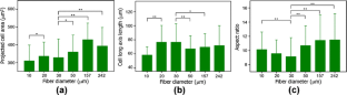 In this study, we investigated the effects of the diameter of microfibers on the orientation (angle between cells’ major axis and the substrate fiber long axis) of adhered cells. For this purpose, mouse fibroblast L929 cells were cultured on the surface of PLGA fibers of defined diameters ranging from 10 to 242 μm, and their adhesion and alignment was quantitatively analyzed. It was found that the mean orientation of cells and the spatial variation of cell alignment angle directly related to the microfiber diameter. Cells that were cultured on microfibrous scaffolds oriented along the long axis of the microfiber and the orientation increased as the fiber diameter decreased. For the fiber diameter of 10 μm, the mean orientation was 3.0 ± 0.2° (mean ± SE), whereas for a diameter of 242 μm, it decreased to 37.7 ± 2.1°. Using these studies we demonstrate that fibroblasts have a characteristic alignment on microscale fibers and that the microscale fiber diameter plays a critical role in cellular orientation. The ability to control cellular alignment on engineered tissue scaffold can be a potentially powerful approach to recreate the microscale architecture of engineered tissues. This may be important for engineering a variety of human tissues such as tendon, muscle and nerves as well as applications in 3D tissue culture and drug screening.