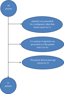 Fifty-one older breast cancer patients were started on alpelisib between May 2019 and September 2020. The median age and number of comorbidities at alpelisib initiation was 71 years and 4, respectively. Thirty-five patients had stopped alpelisib (median time on drug 2.6 months (range: < 1, 9.5 months)) for the following reasons: alpelisib adverse events (n = 15), cancer progression (n = 13), and other/unknown (n = 7). Alpelisib adverse events included hyperglycemia (n = 37), diarrhea (n = 23), rash (n = 19), fatigue (n = 12), and mouth sores (n = 7); (numbers in parentheses indicate the number of patients with at least one such event). Five patients were hospitalized for hyperglycemia. At the time of report, 14 patients were deceased, and median survival had not been reached.