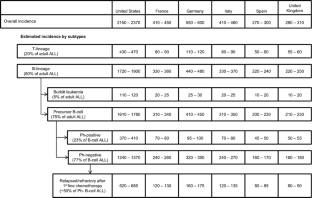 Age-specific incidence data for ALL from select cancer registries in different geographies were obtained from the International Agency for Research on Cancer’s Cancer Incidence in Five Continents Database. Country-specific age-standardized rates were calculated to allow for direct comparisons between countries. ALL-specific mortality and relative survival data were only available from the United States (US) National Cancer Institute’s Surveillance, Epidemiology, and End Results program; mortality rates were estimated for other countries.