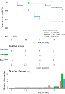 Evidence regarding the relationship between diffuse myocardial fibrosis and the prognosis of heart failure with reduced ejection fraction (HFrEF) was limited. Therefore, this study set out to investigate whether diffuse myocardial fibrosis was independently related to the prognosis of failure with reduced ejection fraction in Chinese patients after adjusting for other covariates. The present study was a cohort study. A total of 45 consecutive HFrEF patients were involved in Zhongshan Hospital of Fudan University in China from 1/9/2015 to 31/12/2016. The target-independent variable was extracellular volume (ECV) quantified by cardiac magnetic resonance T1 mapping using the modified Look-Locker inversion recovery (MOLLI) sequence at baseline. To assess the prognostic impact of MOLLI–ECV, its association with hospitalization for heart failure/cardiac death was tested by multivariable Cox regression analysis. Covariates involved in this study included age, gender, body mass index, heart rate, systolic blood pressure diastolic blood pressure, smoking, hypertension, diabetes mellitus, etiology, NYHA functional class, blood urea nitrogen, creatinine, serum uric acid, total bilirubin, and growth stimulation-expressed gene 2. Ten age- and sex-matched healthy participants with no history of cardiovascular disease served as a control group. Mean MOLLI–ECV was significantly higher in HFrEF patients versus healthy controls (29.55 ± 1.46% vs. 23.17 ± 1.93%, P < 0.001). Patients were followed for 9 months, during which the primary outcome (cardiac death or first heart failure hospitalization) occurred in 15 patients. By Kaplan–Meier analysis, patients with high MOLLI–ECV ≥ 30.10% had shorter event-free survival than the middle (MOLLI–ECV between 30.10 and 28.60) and low (MOLLI–ECV < 28.60) MOLLI–ECV patients (log-rank, P = 0.0035). Result of fully-adjusted multivariable Cox regression analysis showed MOLLI–ECV was positively associated with the composite outcome of HFrEF patients after adjusting confounders hazard ratio (HR) 2.57, 95% CI (1.09, 6.04). By subgroup analysis, a stronger association was seen in patients who with NYHA functional class III–IV, hematocrit < 39.8%, left atrial diameter ≥ 53.5 mm, or without the medical history of MRA or diuretics other than MRA. The P for interaction was < 0.05. In HFrEF patients, the relationship between MOLLI–ECV determined by CMR and the composite outcome is linear. High MOLLI–ECV was associated with a higher rate of cardiac mortality and first HF hospitalization in the short term follow up.