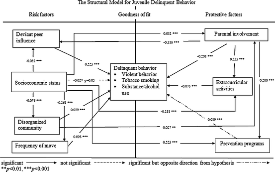 The adolescent’s world of delinquent behaviors and risk and protective factors around each behavior is very complicated and articulating certain characteristics or contents of effective programs thus has been intricate. This paper reports the findings of a study examining an original model with the three problems of major juvenile delinquent behaviors: substance abuse, tobacco smoking and violent behavior, by testing their risk/protective factors derived from theories and past empirical studies. The satisfactory model fit was confirmed with the Structural Equation Modeling and structure of a multidimensional construct in the hypothesized model, which showed specified causal linkage, was validated. The authors also found 10 mediating effects among risk/protective factors either with theoretical/past literature result rationale or authors assumptions which led both to confirmatory and new findings.