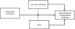This study examined the relationship between community adversity and childhood internalizing and externalizing problems, and whether this relationship is moderated by service utilization and race. The study involved 3225 children ages 2–17, and their caregivers, who participated in the second cohort of the National Survey on Child and Adolescent Well-Being. Bivariate correlation and regression analysis indicate that childhood internalizing problems were correlated with sex and community adversity. Children externalizing problems were correlated with race, sex, service utilization, and community adversity. Childhood internalizing and externalizing problems were highly correlated. Regression analysis reveals a strong relationship between community adversity and childhood externalizing problems. Service utilization was found to significantly and positively moderate the relationship between community adversity and externalizing problems. While a strong correlation between race and childhood externalizing problems exist, race did not moderate the relationship between community adversity and externalizing problems. Internalizing problems were excluded from the regression analysis since it did not correlate with any of the moderator variables. The findings are discussed and the study limitations are examined. Implications for child welfare practice, policy, and research are highlighted.