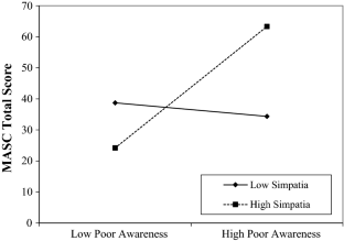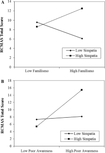 Two way interactions between familismo and simpatia, and between poor emotion awareness and simpatia predicted anxiety level. Graphs of the interactions indicated that the combination of high levels of each variable was associated with the highest levels of child-reported anxiety, while high familismo in the context of low simpatia was associated with low anxiety levels per child and parent report. In contrast, low simpatia in the context of poor emotion awareness was associated with low mother-reported child anxiety.