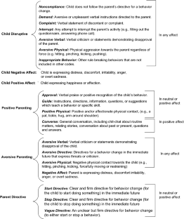 This observation study utilized a microsocial coding system, the Parent–Child Play Task Observation System (PCPTOS), to closely examine parent and child interactions in multiple analogue task situations. The study drew on pre-intervention data for 224 parent–child dyads who participated in a parenting-focused intervention trial for children ages 3–7 who presented elevated levels of disruptive behaviors.