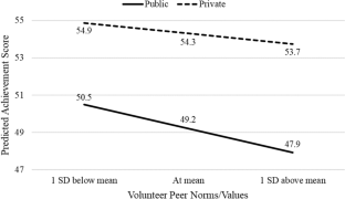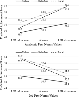 Findings indicated adolescent academic achievement significantly related to peer norms that valued doing well in school, socializing, working, and volunteering; even after controlling for student-level (sex, family socioeconomic status [SES], race/ethnicity, special education eligibility status) and school-level (school type and urbanicity) characteristics. Peer norms that interacted with family SES, student sex, urbanicity, and school type also demonstrated statistical significance in predicting academic achievement. These findings indicate that peer norms relate to high school academic achievement beyond other ecological factors.