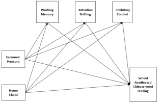 Longitudinal data were collected from a socioeconomically representative sample of 523 Chinese children (mean age 5.38 years; 52.9% male) and their parents and teachers in Hong Kong. Fathers and mothers at Time 1 (start of the school year) reported their perceived economic pressure and home chaos through questionnaires. At Time 2 (end of the school year), children’s EF and Chinese word reading were directly assessed with behavioral tasks, whereas teachers rated children’s school readiness using a questionnaire.