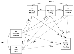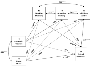 This study examined the longitudinal associations of economic pressure and home chaos with children’s prospective word reading and school readiness and executive functioning (EF) skills of attention shifting, inhibitory control, and working memory.