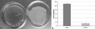 Negatively stained band material synthesized at room temperature under agitated conditions by the wild type G. xylinus (a) and the acsDdm mutant (b). Scale bar represents 0.5 μm (TIFF 561 kb)