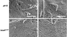 Negatively stained cellulose synthesized from individual cells with enlargements showing examples of the ribbons (a) and bundles of microfibrils within a ribbon (b) in the G. xylinus AY201 wild type; and the ribbons (c) and bundles of microfibrils within a ribbon (d) in the acsDdm mutant. Scale bar represents 25 nm (a and c) and 10 nm (b and c) (TIFF 526 kb)