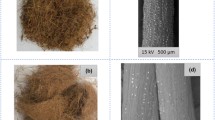 The measured LFs, OPC, water, and additives were mixed properly to prevent the formation of any fiber/cement lumps. In this regard, the LFs were put into a steel drum and continuously stirred with an electric mixer while OPC was gradually poured on them. The mixed LFs and OPCs were mixed for an additional 2 min to ensure uniform mixing. Later, the mixed Na2SiO3 and water solution was also gradually poured into the drum. The stirring was continued constantly during the entire mixing process. Finally, the stirring was continued for additional 2 min to ensure homogeneous mixing of fiber, cement, Na2SiO3, and water. Hence, slurry was formed. After the mixture was prepared, it was mixed manually and poured uniformly into a 400 × 400 mm2 wooden frame and pressed by another wooden lid once the fiber/cement mat had formed. After that, 12 × 12 mm2 steel rods were placed around the pressed LF/cement matrix to produce the boards with expected thickness during the pressing. This was then covered by a polybag, covered by another steel plate, and transferred to the pressing machine. The applied specific pressure in the pressing machine was 8.2 MPa, which was maintained for 24 h. Finally, the board was taken out from the machine and cured for 28 days to ensure better curing of the cements. The same procedure was followed for the remaining three cement boards. six fiber boards were produced for each individual recipe. All four composites were also tested six times for each individual test. The Instron 4208 (Instron Corporation, USA) testing machine was used to investigate the results of flexural properties and internal bonding strengths of the produced LF/cement composites. Testing standard EN 319 was applied for the internal bonding strength analysis. The speed of crosshead movement during the internal bonding strength was 0.8 mm/min. The standard adopted for flexural strength was EN 310 and crosshead movement speed was 5.0 mm/min. The FTIR characterization was performed by FT/IR-6300 model (Jasco, Tokyo, Japan). The SEM, Hitachi, S 3400 N was utilized for studying the surface morphology of the LF/cement composites at accelerating voltage of 15 kV. The thermal stability of the LF, cement, and associated composites were measured using Themys thermal analyzer (TGA, Setaram Instrumentation (Kep Technologies), France) within 25–800 °C temperature under nitrogen atmosphere at 10 °C/min.