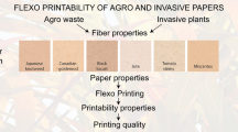 The printed paper thickness was measured following the standard ISO 12,625–3 adapted to compressible structures, which consists in measuring the gap between two flat platens that compress the paper at 2 kPa. The printed paper surface topography was characterized by laser profilometry using a 3D-Map® (Techpap, Grenoble, France). The printed paper cross section was observed using a microtom RM 2125 RTS (Leica Biosystems, Nanterre, France) after the sample was embedded in acrylate and stained with iodine to enhance the contrast between starch and fibres. The bending behaviour was characterized by performing two points bending tests following ISO 2493–1 and the tensile strength was measured following ISO 1924–2. All the tests were carried out in a conditioned atmosphere at 23 °C and 50% RH. Before testing all the samples were pre-conditioned at 30 °C and 33% RH during 24 h, and then conditioned 23 °C and 50% RH during an additional 24 h.