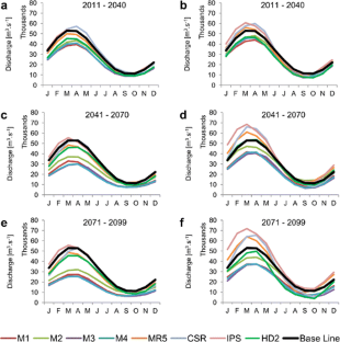 Brazilian strategic interest in the Madeira River basin, one of the most important of the southern Amazon tributaries, includes the development of hydropower to satisfy the country’s growing energy needs and new waterways to boost regional trade and economic development. Because of evidences that climate change impacts the hydrological regime of rivers, the aim of this study was to assess how global climate change and regional land cover change caused by deforestation could affect the river’s hydrological regime. To achieve this goal, we calibrated a large-scale hydrological model for the period from 1970–1990 and analyzed the ability of the model to simulate the present hydrological regime when climate model simulations were used as input. Climate change projections produced by climate models were used in the hydrological model to generate scenarios with and without regional land-use and land-cover changes induced by forest conversion to pasture for the period from 2011–2099. Although results show variability among models, consensus scenarios indicated a decrease in the low-flow regime. When the simulations included forest conversion to pasture, climate change impacts on low flows were reduced in the upper basin, while, in the lower basin, discharges were affected along the whole year due to the more vigorous land-use conversion in the Brazilian region of the basin.