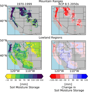 We evaluate the implications of ten twenty-first century climate scenarios for snow, soil moisture, and fuel moisture across the conterminous western USA using the Variable Infiltration Capacity (VIC) hydrology model. A decline in mountain snowpack, an advance in the timing of spring melt, and a reduction in snow season are projected for five mountain ranges in the region. For the southernmost range (the White Mountains), spring snow at most elevations will disappear by the end of the twenty-first century. We investigate soil and fuel moisture changes for the five mountain ranges and for six lowland regions. The accelerated depletion of mountain snowpack due to warming leads to reduced summer soil moisture across mountain environments. Similarly, warmer and drier summers lead to decreases of up to 25% in dead fuel moisture across all mountain ranges. Collective declines in spring mountain snowpack, summer soil moisture, and fuel moisture across western mountain ranges will increase fire potential in flammability-limited forested systems where fuels are not limiting. Projected changes in fire potential in predominately fuel-limited systems at lower elevations are more uncertain given the confounding signals between projected changes in soil moisture and fuel moisture.