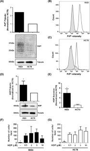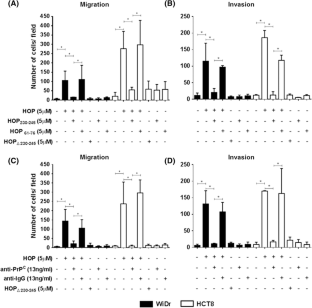 Supplementary material 1 (TIFF 664 kb). (A) Migration and (B) Invasion assays in WiDr and HCT8 cell lines. Cells were incubated on the top of boyden chambers coated with matrigel®; Serum-free DMEM or DMEM + 10 % FBS were used as chemoattractants. Data represent the average of at least four independent experiments ± standard error. [*p < 0.05 by Student’s t test]. (C) BrdU proliferation assay performed in WiDr CRC cells in conditions that mimicked the migration/invasion experiments. Cells were plated in 96 well plates and treated with recombinant HOP (5 µM) or 10 % FBS, a condition treated with 10 % FBS for 48 h was also included as positive control. Graph shows the levels of BrdUincorporation in relation to control, non-treated with HOP or FBS, and represents the average of at least four independent experiments ± standard error.