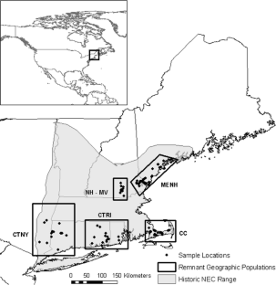 The New England cottontail (Sylvilagus transitionalis) has suffered from extensive loss and fragmentation of its habitat and is now a species of conservation priority in the northeastern United States. Remnant New England cottontail populations currently occur in five geographically disjunct locations: southern Maine and southeastern New Hampshire (MENH); the Merrimack Valley in central New Hampshire (NH-MV); Cape Cod, Massachusetts (CC); parts of eastern Connecticut and Rhode Island (CTRI); and western Connecticut, southeastern New York and southwestern Massachusetts (CTNY). We used microsatellite genotyping to discern patterns of population structure, genetic variability, and demographic history across the species’ range and to assess whether the observed patterns are a consequence of recent habitat loss and fragmentation. Our findings show that the geographic populations are highly differentiated (overall F ST = 0.145; P < 0.001). Using Bayesian clustering analyses, we identified five genetic clusters, which corresponded closely to the geographic populations, but grouped MENH & NH-MV together (ME/NH) and identified an isolated population in eastern Connecticut (Bluff Point). The genetic clusters showed little evidence of recent gene flow and are highly influenced by genetic drift. The CC and Bluff Point populations show signs they experienced a genetic bottleneck, whereas the ME/NH population shows evidence of ongoing decline. Populations in Bluff Point, CC, and ME/NH also show significantly reduced genetic variation relative to the other clusters (CTNY and CTRI without Bluff Point). Without immediate human intervention, the short-term persistence of New England cottontail populations in Maine, New Hampshire and Cape Cod is at great risk. Conservation efforts at this time should focus on within-population sustainability and eventually restoring connectivity among these isolated populations.