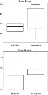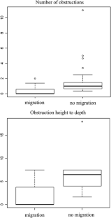 Barriers to migration are numerous in stream environments and can occur from anthropogenic activities (such as dams and culverts) or natural processes (such as log jams or dams constructed by beaver (Castor canadensis)). Identification of barriers can be difficult when obstructions are temporary or incomplete providing passage periodically. We examine the effect of several small irrigation diversion dams on the recent migration rates of steelhead (Oncorhynchus mykiss) in three tributaries to the Methow River, Washington. The three basins had different recent migration patterns: Beaver Creek did not have any recent migration between sites, Libby Creek had two-way migration between sites and Gold Creek had downstream migration between sites. Sites with migration were significantly different from sites without migration in distance, number of obstructions, obstruction height to depth ratio and maximum stream gradient. When comparing the sites without migration in Beaver Creek to the sites with migration in Libby and Gold creeks, the number of obstructions was the only significant variable. Multinomial logistic regression identified obstruction height to depth ratio and maximum stream gradient as the best fitting model to predict the level of migration among sites. Small irrigation diversion dams were limiting population interactions in Beaver Creek and collectively blocking steelhead migration into the stream. Variables related to stream resistance (gradient, obstruction number and obstruction height to depth ratio) were better predictors of recent migration rates than distance, and can provide important insight into migration and population demographic processes in lotic species.