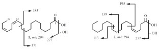 Two new compounds, n-13,16-nonadecadienoic acid (1) and n-4,11-nonadecadienoic acid (2), and six other compounds, 7-nonadecenoic acid (3), 12-nonadecenoic acid (4), 14-methylstigmasta-7,24(28)-dien-3-ol (5), 21α-hydroxyserrat-14-en-3β-ol (6), longifloroside (7), and 1-(4-hydroxy-3-methoxyphenyl)-2-[4-(3-hydroxypropyl)-2-methoxyphenoxy]-propane-1,3-diol (8), were isolated from soy germ. The structures were established using data from IR and NMR spectra.