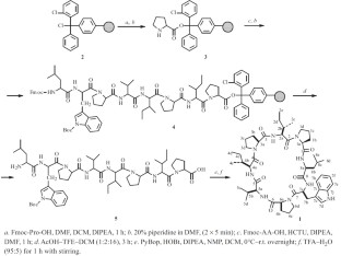 The total synthesis of a naturally occurring proline-enriched cyclic octapeptide, reniochalistatin E, from a marine sponge, where all the amino acids have the L-configuration, was reported. The reniochalistatin E was synthesized by applying a two-step solid-phase/solution synthesis strategy. The linear octapeptide was assembled by standard Fmoc chemistry on the solid phase, and subsequently cyclization was achieved by a solution method. The final product was purified by a preparative RP-HPLC system, and its structure was identified by HR-QTOF-MS, and 1H and 13C NMR.