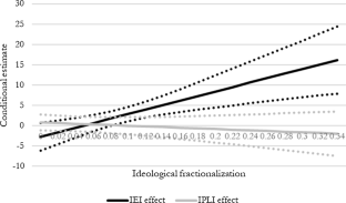 We also provide first indications of the association between corruption and the direction of the constitutional reforms in Figures A2 and A3 in the appendix, where we plot the association between the average corruption between 1970 and 2014 and the IPLI and EIE respectably. As the figures illustrate, the correlation between corruption and the IPLI and IEI are far from homogeneous.