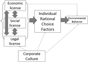 Prior research on corporate environmental behavior has produced myriad factors that explain offending and overcompliance, yet the literature lacks cohesion and would benefit from disentangling corporate- and individual-level explanations. In this study, a cross-level integrated theory of corporate environmental behavior uses Gunningham et al’s. (2003) license framework and Paternoster and Simpson’s (1993; 1996) rational choice theory of corporate crime to portray how individuals within corporations decide to offend or to overcomply with environmental regulations while accounting for the organizational context. Specifically, external pressures (legal, social, and economic) on the corporation, plus internal corporate policies and culture, affect individual-level cost-benefit analyses. In turn, these cost-benefit calculations impact the behavioral decisions made by corporate managers. Four sets of hypotheses based on this integration are tested using an environmental vignette survey of individuals. The results provide mixed support for the integrated theory. It is also noted that predictors of environmental offending are different from those predicting overcompliance. Implications for theory and practice are discussed.