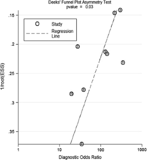 Deeks JJ, Macaskill P, Irwig L. The performance of tests of publication bias and other sample size effects in systematic reviews of diagnostic test accuracy was assessed. J Clin Epidemiol. 2005;58:882–893.