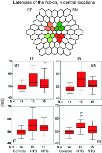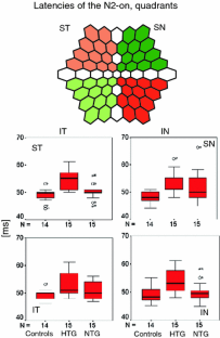 The intent of our study was to evaluate whether the response to a long-duration white stimulus in the multifocal electroretinogram (mfERG) is sufficiently sensitive to detect early retinal dysfunction in glaucoma. On–off mfERGs were recorded from 15 NTG and 15 HTG patients and compared with 14 control subjects. Recording parameters were the following: LED stimulus screen (RETIscan™), 100-ms stimulus duration, 200-ms stimulus interval, 11-min total recording time, stimulus matrix of 61 elements, frame rate: 70 Hz, Lmax: 180 cd/m2, Lmin: 0 cd/m2, and filter setting: 1–200 Hz. The second negative response following stimulus onset (N2-on), as well as following stimulus offset (N2-off), was analyzed as an overall response and in quadrants, as well as in 4 small central and four adjoining peripheral areas per quadrant. The latency of the N2-on was significantly delayed in HTG in all response averages tested, while in NTG this was only seen in the overall response and in the small central response averages (P < 0.05). The most sensitive measure in HTG was the latency of the N2-on of the small peripheral response average of the superior temporal quadrant with an area under the ROC curve of 0.881. For NTG, the most representative measure was the latency of the N2-on of the small central response average of the inferior nasal quadrant with an area under the ROC curve of 0.793. Our results showed that in stimulation with long-duration flashes, the second negative response following the on response, representative of the early PhNR, is affected in glaucoma where N2-on showed a latency delay in POAG patients. The latency delay of the N2-on was more prominent for HTG than for NTG.