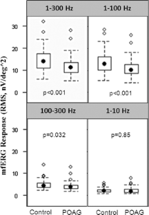 Filtering at 1–300 Hz showed significantly lower responses in POAG than in control subjects (p < 0.001) for all epochs analysed. At 1–100 Hz, this also held true even though the difference between the groups became smaller. At 1–10 Hz, responses were extremely small and did not differ between POAG and control (p > 0.5). This would suggest a filter setting of 10–300 Hz for mfERG recordings in POAG. However, when a filter setting of 10–300 Hz was compared to 1–300 Hz, with a filter setting of 10–300 Hz, the DC in POAG differed more (p < 0.0001) from normal than with 1–300 Hz (p = 0.0002). For IC1 and IC2, the stronger difference between POAG and control was found with 1–300 Hz (p < 0.0001) rather than with 10–300 Hz (p < 0.0001 and p = 0.0005, respectively). For the ‘oscillatory potentials’ at 100–300 Hz, POAG and control differed significantly in IC1 and IC2 (p < 0.05), but not in DC (p = 0.8). However, filtering at 200–300 Hz did not show a difference between POAG and control (p > 0.5). Thus, we applied a filter setting of 1–200 Hz, which seemed to be most sensitive in detecting glaucomatous retinal dysfunction (p < 0.0001).
