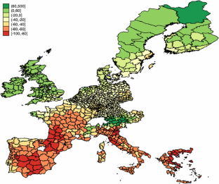 The grid sizes for the three climate models are considerably larger than the NUTS3 regions. The statistical downscaling we rely on generates a smooth prediction across space. It should be understood that these local predictions are plausible but highly uncertain.