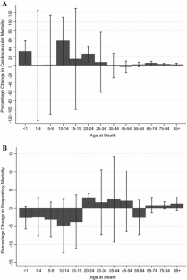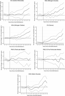 Our treatment of air pollution has been a single-pollutant approach. A growing epidemiology literature calls for use of “multi-pollutant models” to estimate the effects of air pollution and health outcomes (Vedal and Kaufman 2011; Dominici et al. 2010). As a robustness check, we simultaneously estimated the impact of EAB jointly on all gaseous pollutants (CO, O3, NO2, NOx, and SO2) and on mortality outcomes using a full-information maximum likelihood function (3SLS). This model included a full set of five-way pollution concentration interactions. Results are similar to those from the single-pollutant model in Fig. 2.