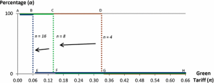 There is a threshold level for the green tariff \(\left( {\pi _L } \right) \), below which an individual maximizes her utility by paying the green tariff on her entire consumption of the private good (corner solution). Put differently, when \(\pi <\pi _L \), the constraint \(\alpha _i \in \left[ {0,1} \right] \) binds at \(\alpha _i^+ =1\). As long as \(\pi <\pi _L \), total contributions \((g^{+}=nM/\left( {P_Y /\pi +1} \right) )\) continually rise with \(\pi \), however, they also stay lower than the same under the VCM or the GTM with an interior solution. If \(g^{*}\) represents the total contributions to green electricity at the symmetric Nash equilibrium under the VCM or the GTM with an interior solution, then the solution to \(\pi _L \) is given by \(g^{*}/g^{+}=1\), which implies \(g^{+}\left\{ {{\begin{array}{l} {<g^{*}{} \textit{ if }\pi <\pi _L } \\ {=g^{*}{} \textit{ if }\pi \ge \pi _L } \\ \end{array} }} \right. \).