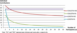 The parameters used for Fig. 2 are: \(C=P_Y =\pi =1\) and \(M=120\). As in Example 3(i), the warm-glow component in the utility function is assumed to be \(0.5\sqrt{g_i }\). With these specifications, individual contributions under the VCM and GTM are given by: \(g_i^*=g_i^+ =\left[ {120\left( {0.5+\frac{1}{\sqrt{n}}} \right) ^{2}} \right] \Big /\left[ {1+\left( {0.5+\frac{1}{\sqrt{n}}} \right) ^{2}} \right] \).
