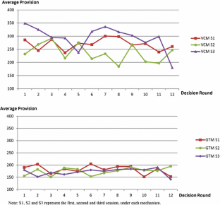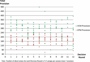 Note that the marginal per capita return (MPCR) from the public good at the SNE under the VCM (or GTM with interior solutions) is given by: \(\textit{MPCR}=\hbox {C}\sqrt{\hbox {ng}_{\mathrm{i}}^{*} }=\sqrt{120\hbox {n}/\left( {\hbox {n}+1} \right) }\), (assuming \(\hbox {C}=\hbox {P}_{\mathrm{Y}} =1\) and \(\hbox {M}=120)\). Now if \(\hbox {n}=4,5,6\) or 7, then \(\hbox {MPCR}=9.80,10,10.14\) or 10.25. This formulation is in complete accord with treatment #3 (that states altering \(\hbox {n}\) also alters MPCR) on page 182 in Issac and Walker (1988). We thank an anonymous referee for bringing our attention to this insightful paper.