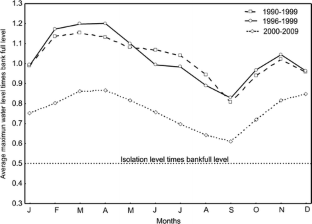 Changes in fish densities recorded over 14 years (1996–2009) were studied for effects of long-term variation of the hydrologic regime. We collected field data with an echo sounder in scour holes of minor channels draining an area of floodplain in the middle reach of the Paraná River. Fish densities in 2000–2009 were significantly lower than in the previous decade. The decrease was associated with a marked reduction of water levels, flood magnitudes and connectivity of channels with the nearby floodplain lakes. This distortion of the flood pulse likely had an effect on the life history strategies of the fishes. The effects of damming in the upstream basin and other man-made perturbations are minor in the middle reach. However, the decadal alterations of regime are intimately linked to climate fluctuations in the Paraná River basin during the past century. Tendencies of observed fish densities are similar to results reported in literature on the influence on fishes for similar long-term alterations of the flood regime in river flood plain systems.