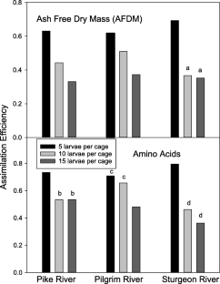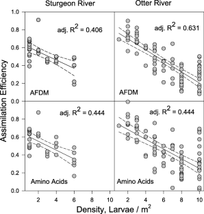 We studied the effect of larval density on food utilization by sediment-dwelling northern brook lamprey (Ichthyomyzon fossor) larvae in the Otter River, Baraga County, MI, USA using field surveys and in situ cage experiments. Field surveys found that food utilization was inversely proportional to density across the range of 1 to 10 larvae/m2. Compared to 1 larvae/m2, values at 10 larvae/m2 were lower by an average of 36% for gut fullness, by 32% for selective ingestion of organic matter, and by 71% and 58% for assimilation of diet organic matter and diet amino acids, respectively. In situ cage experiments and additional field studies in other nearby rivers revealed the same relationships. We hypothesize that physical disturbance of the sediment by adjacent larvae interferes with food utilization with the frequency of disturbance proportional to density. Condition factors were not correlated with density and indicate that individual larvae minimize the effect of crowding by moving away from higher density patches. We conclude that these findings are generalizable to other lamprey species in similar environments in which lower rates of growth, maturation, and survivorship of lamprey larvae at higher densities have been reported by other researchers.