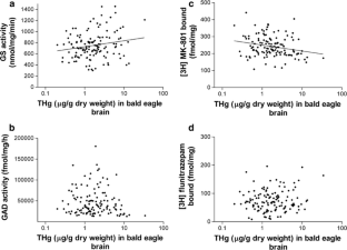 In this study, we assessed mercury (Hg) exposure in several tissues (brain, liver, and breast and primary feathers) in bald eagles (Haliaeetus leucocephalus) collected from across five Great Lakes states (Iowa, Michigan, Minnesota, Ohio, and Wisconsin) between 2002–2010, and assessed relationships between brain Hg and neurochemical receptors (NMDA and GABAA) and enzymes (glutamine synthetase (GS) and glutamic acid decarboxylase (GAD)). Brain total Hg (THg) levels (dry weight basis) averaged 2.80 μg/g (range: 0.2–34.01), and levels were highest in Michigan birds. THg levels in liver (r p = 0.805) and breast feathers (r p = 0.611) significantly correlated with those in brain. Brain Hg was not associated with binding to the GABAA receptor. Brain THg and inorganic Hg (IHg) were significantly positively correlated with GS activity (THg r p = 0.190; IHg r p = 0.188) and negatively correlated with NMDA receptor levels (THg r p = −0245; IHg r p = −0.282), and IHg was negatively correlated with GAD activity (r s = −0.196). We also report upon Hg demethylation and relationships between Hg and Se in brain and liver. These results suggest that bald eagles in the Great Lakes region are exposed to Hg at levels capable of causing subclinical neurological damage, and that when tissue burdens are related to proposed avian thresholds approximately 14–27% of eagles studied here may be at risk.