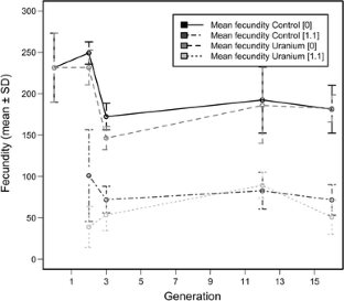 Mean fecundity (± Standard Deviation) as a function of the generation for MGC (Control population) and MGU (Uranium population) exposed to 0 mM U, 0.1 mM U, 0.3 mM U, 0.5 mM U, 0.9 mM U, 1.1 mM U, and 1.2 mM U (PNG 775 kb)