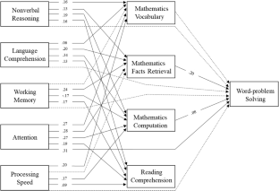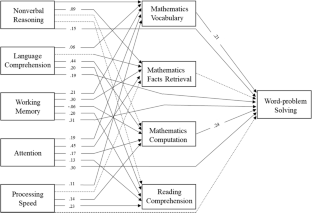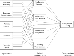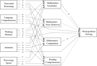 The purpose of the present study is to clarify the contributions of cognitive skills (nonverbal reasoning, language comprehension, working memory, attention, processing speed) and academic skills (mathematics facts retrieval, mathematics computation, mathematics vocabulary, reading comprehension) in performing mathematics word problems among elementary school students. With the two-stage meta-analytic structural equation modeling approach, I synthesized 112 correlation matrices from 98 empirical studies (N = 111,346) and fitted the hypothesized partial mediation model. Overall, path analysis indicated that language comprehension, working memory, attention, mathematics vocabulary, and mathematics computation were unique predictors of word-problem solving. Subgroup analysis demonstrated different unique predictors for younger and older students to perform word problems (K-2nd grades versus 3rd–5th grades). Implications, limitations, and future directions are discussed.