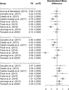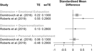 Over the last decades, extensive research has given considerable attention to teachers’ burnout. Owing to its negative personal, organizational, and social impacts (e.g., mental ill health, decreased work performance, turnover), intervention and prevention efforts have consequently been employed to minimize the effects of this phenomenon/syndrome. As teaching-specific stressors are mainly related to the socio-emotional domain, interventions targeting social and emotional learning (SEL) for teachers have been seen to increase in recent years. A meta-analysis of 13 empirical studies was conducted to investigate the effects of SEL interventions on teachers’ burnout. Results showed a statistically significant medium effect size favoring the experimental group regarding the impact of SEL on emotional exhaustion (g = − 0.37, 95% CI [− 0.70, − 0.03]) and personal accomplishment (g = 0.45, 95% CI [0.12, 0.79]). Impacts on depersonalization (g =− 0.51, 95% CI [− 1.13, 0.11]) were found to be not statistically significant. Meta regression analyses found narrower confidence intervals for interventions carried out over 3 months and tailored to the precise needs of class-level teachers for personal accomplishment. The findings add to the growing empirical evidence of the contribution of SEL interventions to improving teachers’ personal accomplishment, identified in prior literature as a mitigating factor of teacher burnout syndrome and diminishing their emotional exhaustion, thus sustaining the importance of promoting SEL within teacher training. As for their practical and methodological implications, the results contribute to understanding the role of the specific features of SEL interventions, and also important features of research design and methodological constraints, which may impact the effectiveness of these interventions.