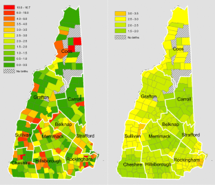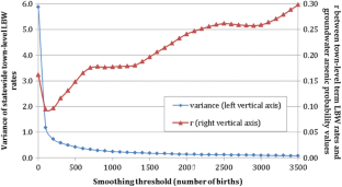 There is increasing evidence of the role of arsenic in the etiology of adverse human reproductive outcomes. Because drinking water can be a major source of arsenic to pregnant women, the effect of arsenic exposure through drinking water on human birth may be revealed by a geospatial association between arsenic concentration in groundwater and birth problems, particularly in a region where private wells substantially account for water supply, like New Hampshire, USA. We calculated town-level rates of preterm birth and term low birth weight (term LBW) for New Hampshire, by using data for 1997–2009 stratified by maternal age. We smoothed the rates by using a locally weighted averaging method to increase the statistical stability. The town-level groundwater arsenic probability values are from three GIS data layers generated by the US Geological Survey: probability of local groundwater arsenic concentration >1 µg/L, probability >5 µg/L, and probability >10 µg/L. We calculated Pearson’s correlation coefficients (r) between the reproductive outcomes (preterm birth and term LBW) and the arsenic probability values, at both state and county levels. For preterm birth, younger mothers (maternal age <20) have a statewide r = 0.70 between the rates smoothed with a threshold = 2,000 births and the town mean arsenic level based on the data of probability >10 µg/L; for older mothers, r = 0.19 when the smoothing threshold = 3,500; a majority of county level r values are positive based on the arsenic data of probability >10 µg/L. For term LBW, younger mothers (maternal age <25) have a statewide r = 0.44 between the rates smoothed with a threshold = 3,500 and town minimum arsenic concentration based on the data of probability >1 µg/L; for older mothers, r = 0.14 when the rates are smoothed with a threshold = 1,000 births and also adjusted by town median household income in 1999, and the arsenic values are the town minimum based on probability >10 µg/L. At the county level for younger mothers, positive r values prevail, but for older mothers, it is a mix. For both birth problems, the several most populous counties—with 60–80 % of the state’s population and clustering at the southwest corner of the state—are largely consistent in having a positive r across different smoothing thresholds. We found evident spatial associations between the two adverse human reproductive outcomes and groundwater arsenic in New Hampshire, USA. However, the degree of associations and their sensitivity to different representations of arsenic level are variable. Generally, preterm birth has a stronger spatial association with groundwater arsenic than term LBW, suggesting an inconsistency in the impact of arsenic on the two reproductive outcomes. For both outcomes, younger maternal age has stronger spatial associations with groundwater arsenic.